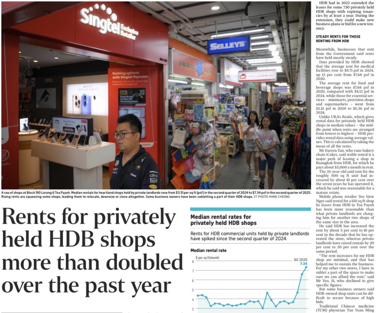- Private landlords of HDB shops are asking a lot more at renewal; tenants report step-ups around 30% and, in some cases, sharper.