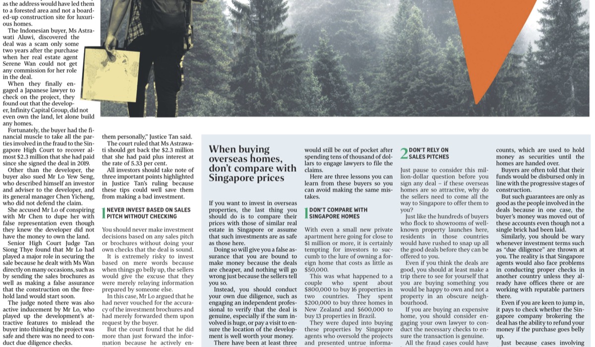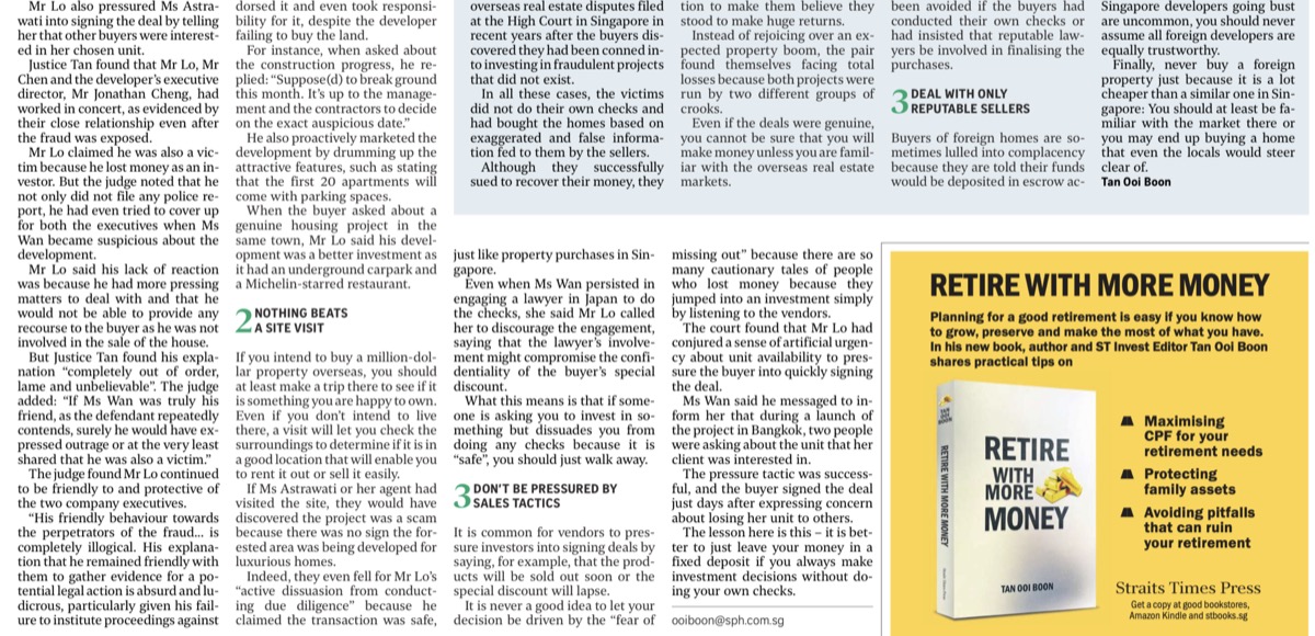 The victim, Ms Astrawat Aluwi, and her representative were persuaded by sales agents that the development was as safe as any in Singapore. They skipped hiring a lawyer and relied on glossy brochures and reassuring sales talk. By the time they checked with a Japanese lawyer two years later, it was too late. The court later ruled that she had been defrauded and ordered the scammers to repay her losses with interest.